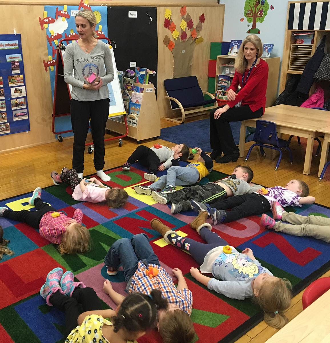 On a recent afternoon in Michelle Benjamin’s classroom, yoga instructor Colleen Smith asked a group of three-year-old program (3YP) students to sit back and put a small rubber duck (or “breathing buddThe students go through a series of movements during the session before Smith tells them “great job” and says goodbye until next time.