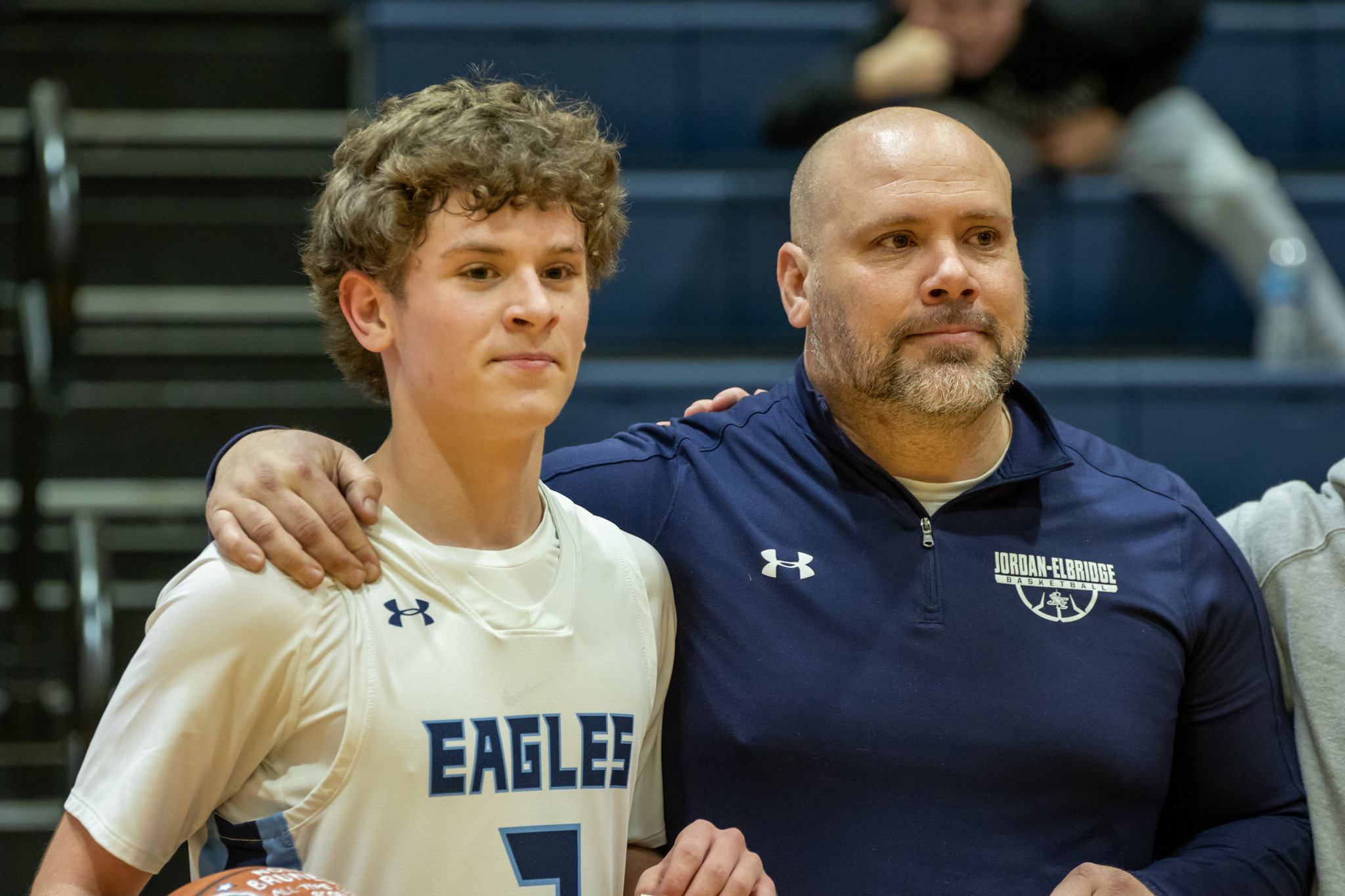 For over two decades, the name Ryan Brunelle stood atop the Jordan-Elbridge boys basketball scoring leaderboard. Coach Brunelle, a 1999 graduate, had surpassed Bobby North’s long-standing record from 1954. Now, history was about to come full circle, with Coach Brunelle watching from the sidelines—not just as a coach, but as a father.