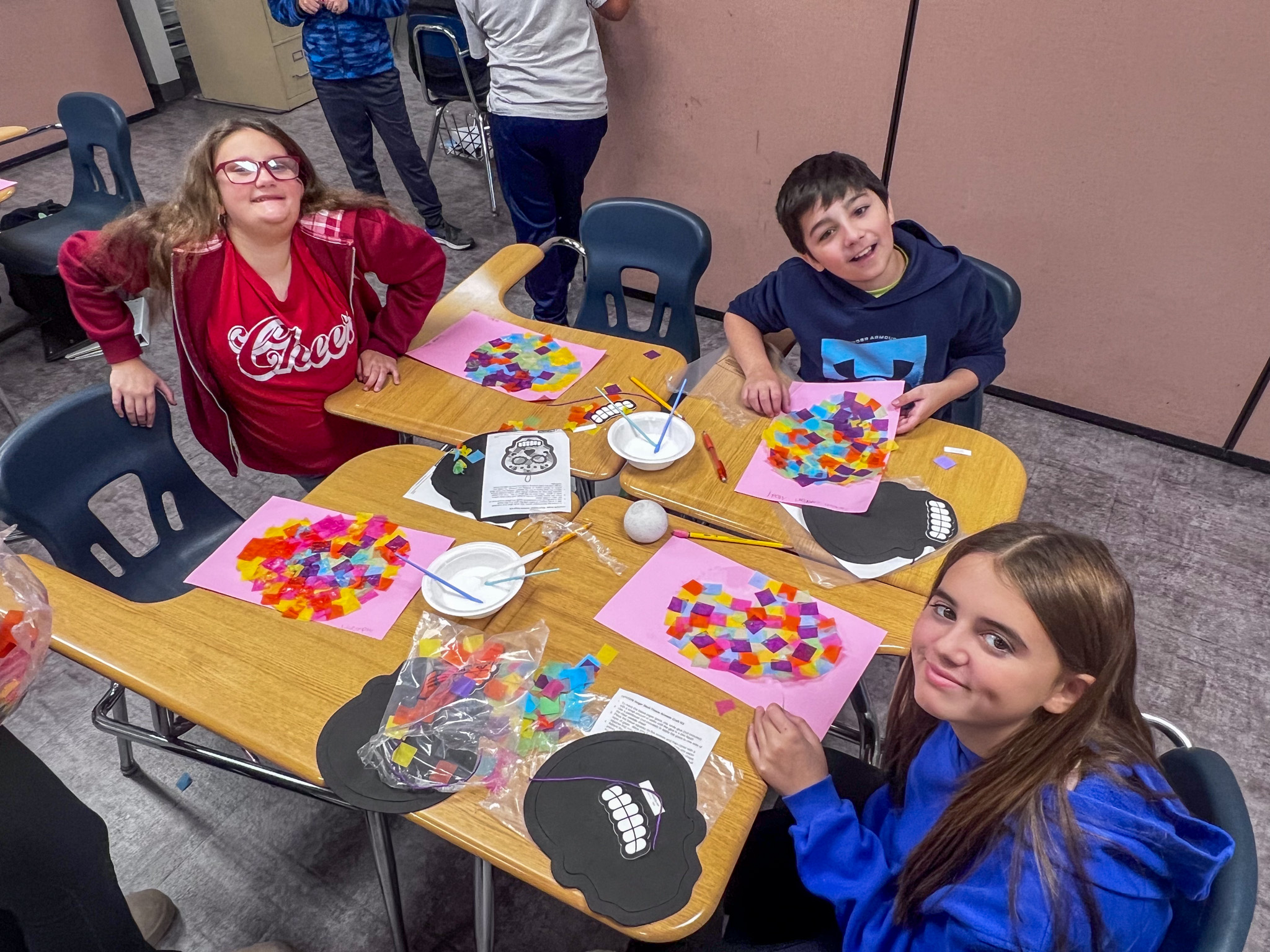 Using tissue paper squares, glue, and clear templates, students designed radiant sugar skulls that celebrate both art and cultural appreciation. The activity encouraged students to blend bright colors, overlap translucent tissue, and explore patterns before layering their creations behind decorative black skull outlines.