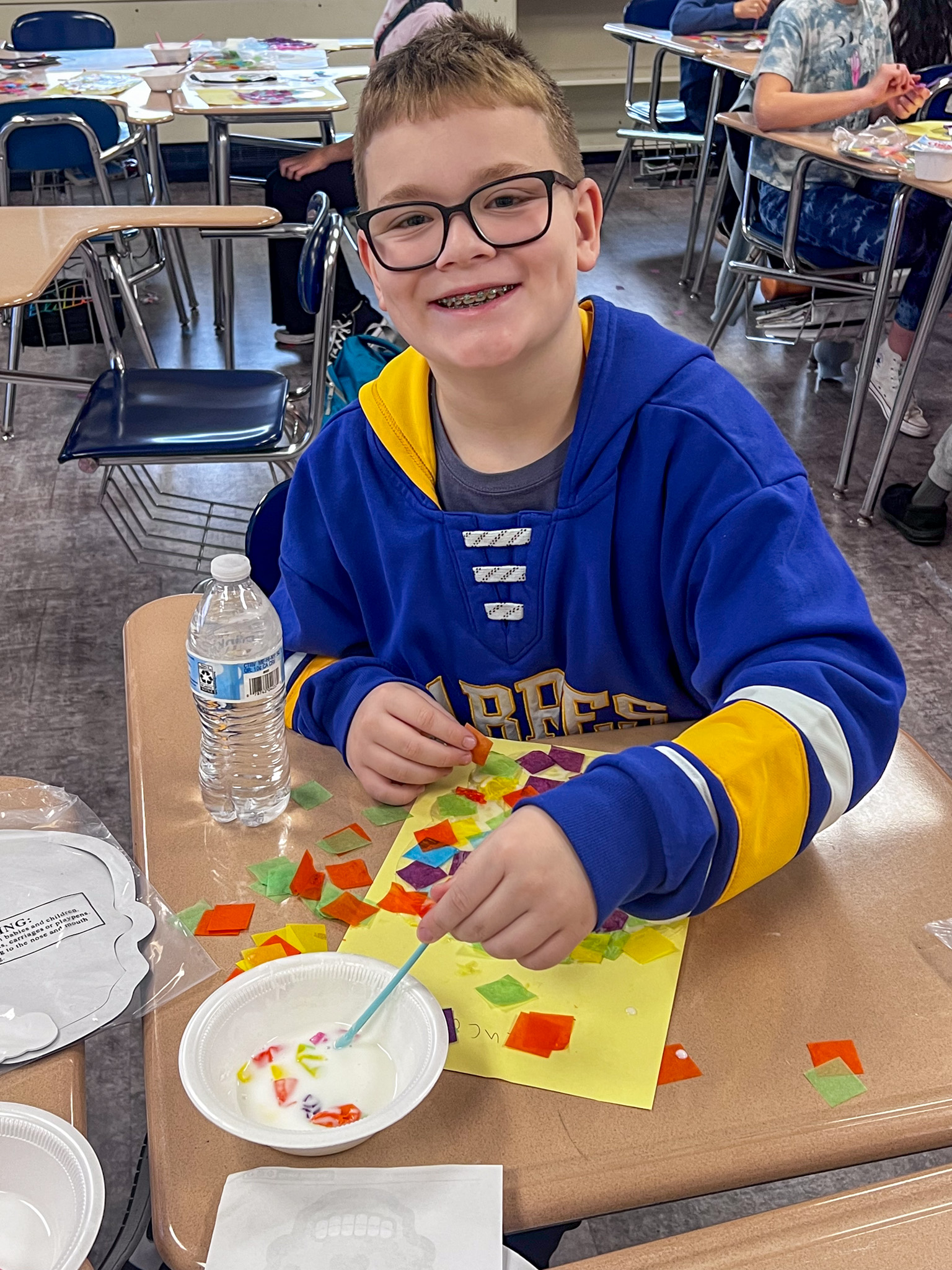 Students worked in pairs and small groups, sharing materials, ideas, and laughter as they brushed glue and layered colorful squares across their templates. The classroom buzzed with excitement as students compared color combinations and proudly displayed their designs.