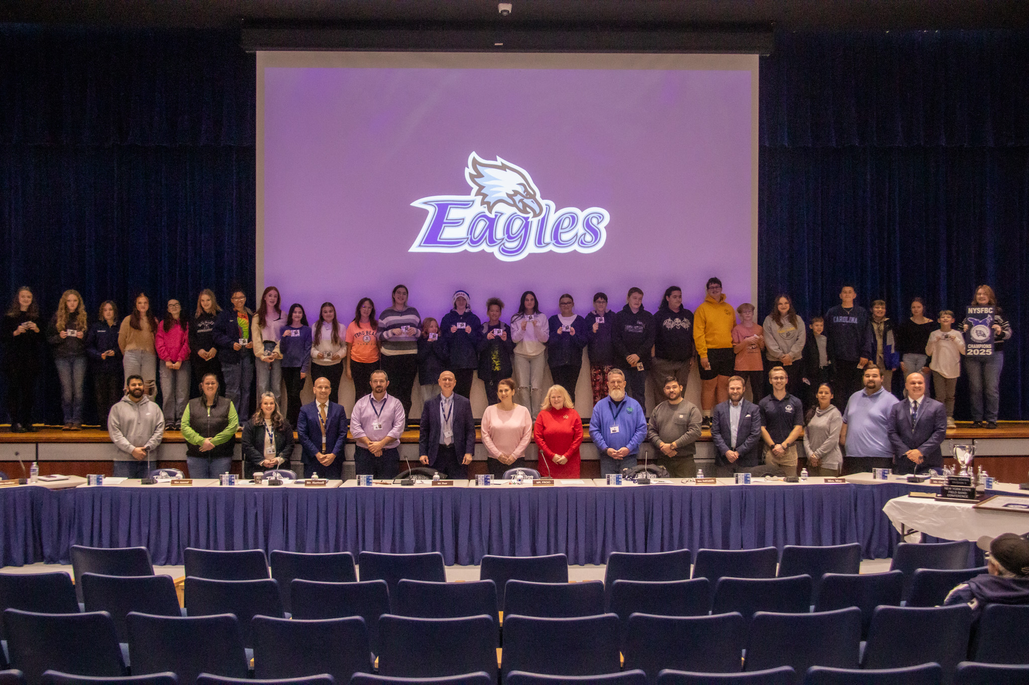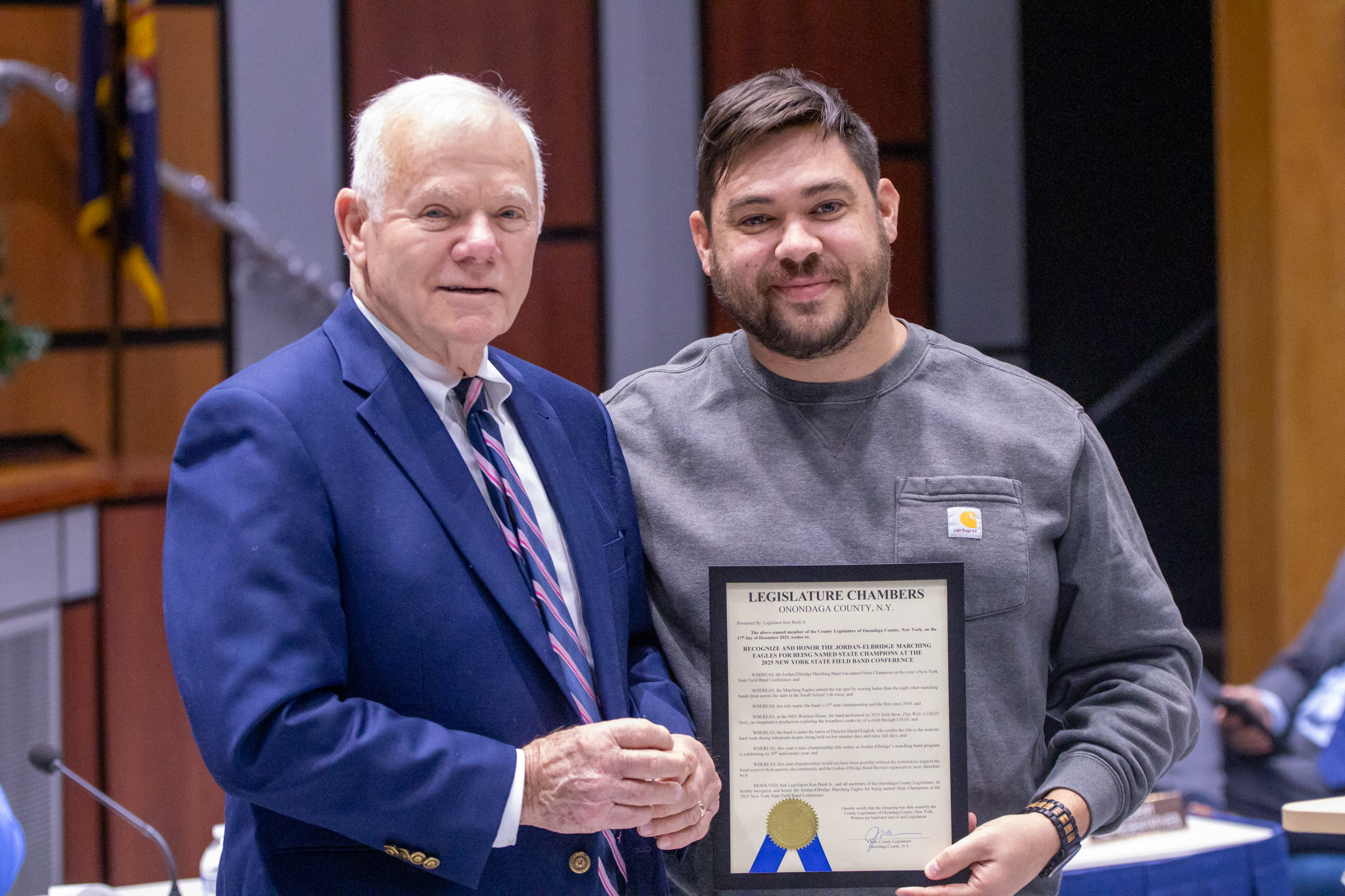 The Jordan-Elbridge Central School District Board of Education meeting held last night in the Jordan-Elbridge High School Auditorium featured a special moment of celebration as Onondaga County Legislator Ken Bush, Jr. formally recognized and honored the Jordan-Elbridge Marching Eagles for being named State Champions at the 2025 New York State Field Band Conference (NYSFBC) Championships.